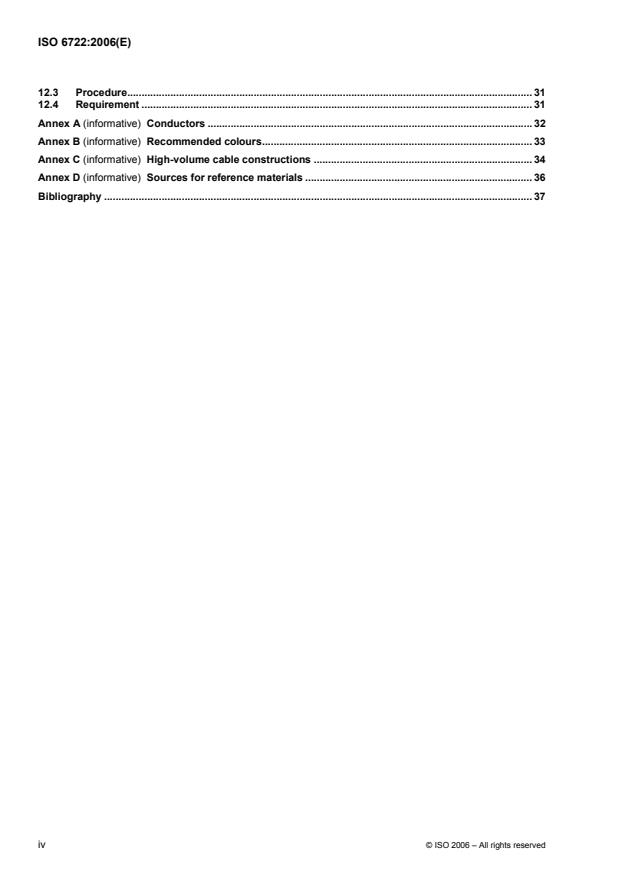 ISO 6722:2006 specifies the dimensions, test methods, and requirements for single-core 60 V cables intended for use in road vehicle applications where the nominal system voltage is equal to or less than (60 V d.c. or 25 V a.c.). It also specifies additional test methods and/or requirements for 600 V cables intended for use in road vehicle applications where the nominal system voltage is greater than (60 V d.c. or 25 V a.c.) to equal to or less than (600 V d.c. or 600 V a.c.). It also applies to individual cores in multi-core cables.