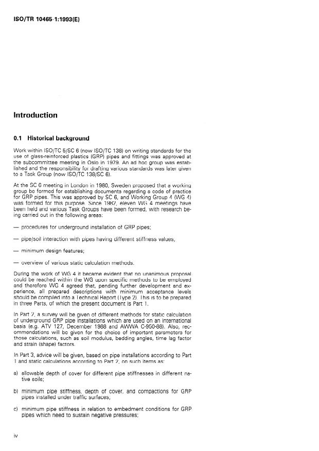 ISO/TR 10465-1:1993 is a technical report published by the International Organization for Standardization (ISO). Its full title is "Underground installation of flexible glass-reinforced thermosetting resin (GRP) pipes — Part 1: Installation procedures". This standard covers: Gives pipeline installation terminology and describes the installation procedures. Refers generally to GRP pipes in particular stiffness classes for which performance requirements have been specified in at least one product standard, but it can also be used as a guide for the installation of pipes of other stiffness classes. Annex A gives a classification of native soils.