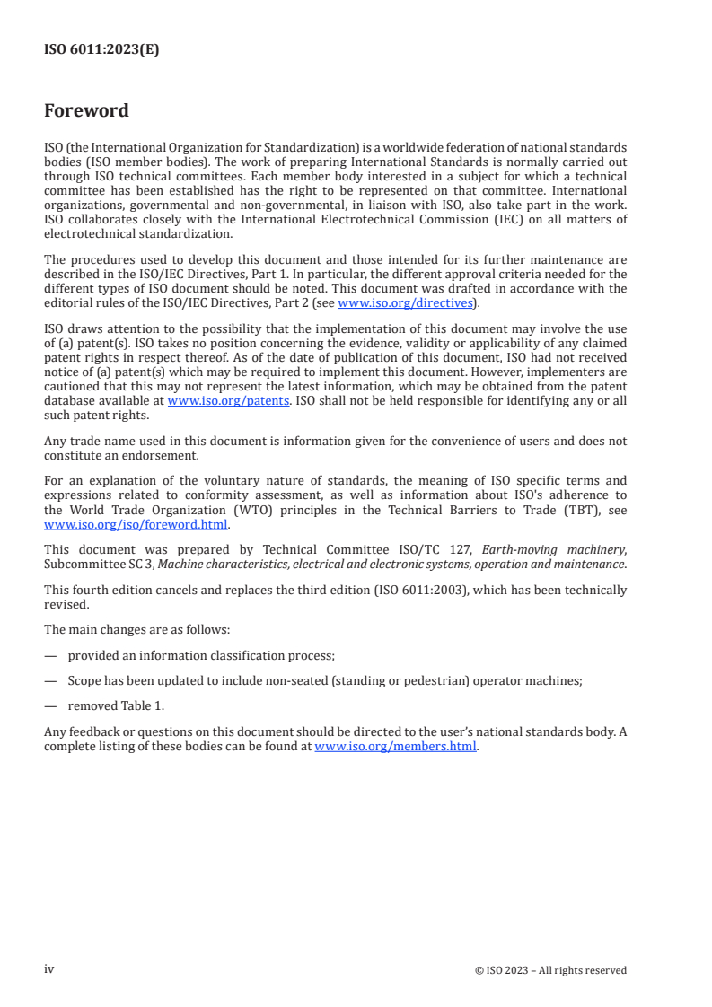 ISO 6011:2023 is a standard published by the International Organization for Standardization (ISO). Its full title is "Earth-moving machinery - Visual display of machine operation". This standard covers: This document provides requirements and principles for location and visibility, information classification, characteristics and colour of visual displays of direct-control earth-moving machinery (EMM) as defined in ISO 6165 for the operator in the intended operating position, as recommended by the manufacturer. The principles of this document can be applied to remote-control earth-moving machinery.