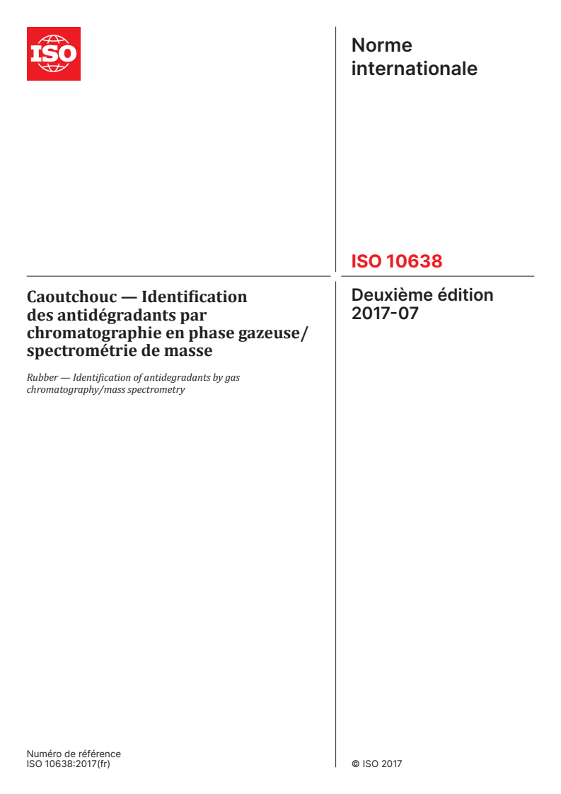ISO 10638:2017 - Rubber — Identification of antidegradants by gas chromatography/mass spectrometry Released:7/25/2017