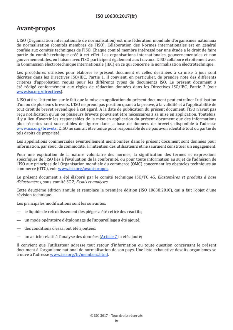 ISO 10638:2017 is a standard published by the International Organization for Standardization (ISO). Its full title is "Rubber — Identification of antidegradants by gas chromatography/mass spectrometry". This standard covers: This document specifies a method using gas chromatography/mass spectrometry, for the identification of antidegradants in raw rubbers, latices, unvulcanized-rubber compounds and vulcanized-rubber products. It is applicable to the 31 types of antidegradant listed in Annex A. The method specified is qualitative and is not intended for quantitative analysis.