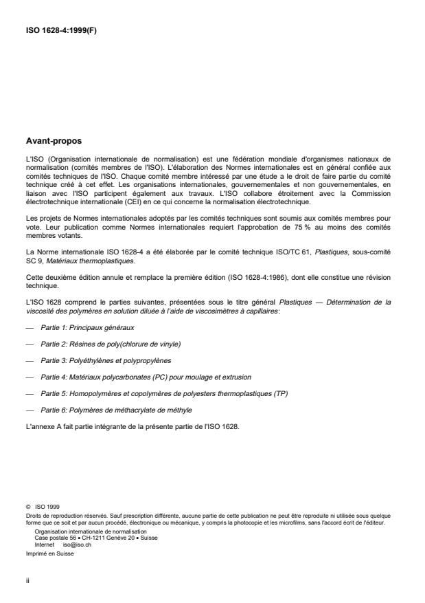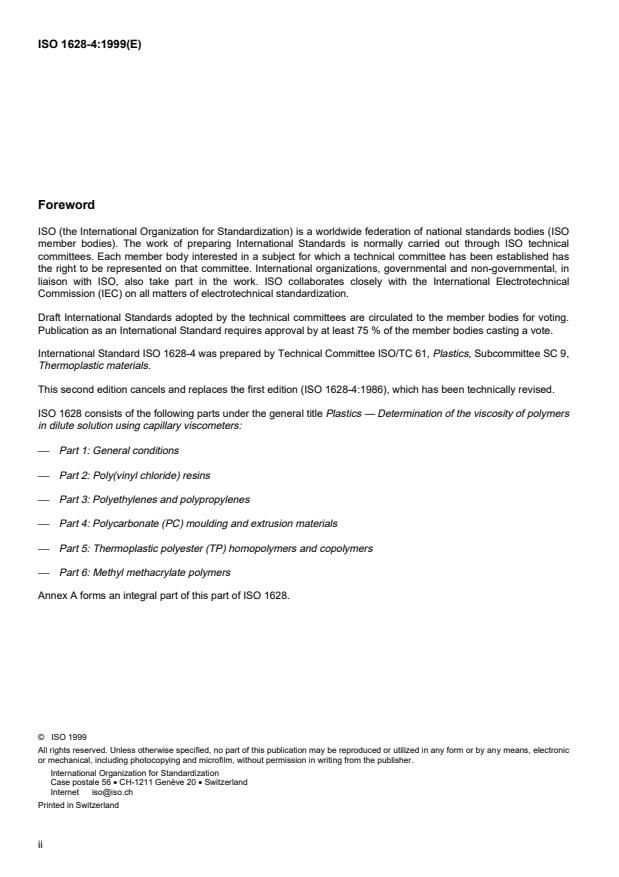 ISO 1628-4:1999 is a standard published by the International Organization for Standardization (ISO). Its full title is "Plastics — Determination of the viscosity of polymers in dilute solution using capillary viscometers — Part 4: Polycarbonate (PC) moulding and extrusion materials". This standard covers: This part of ISO 1628 describes the conditions necessary for the determination of the viscosity number (also known as the reduced viscosity) and the relative viscosity of polycarbonates in dilute solution. It can be used for pure polycarbonates and blends with other polymers, as well as mixtures of both, with or without fillers, as defined in ISO 7391-1.