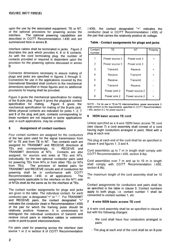 Specifies the 8-pole connector (plug and jack) and the assignments of poles/contacts for use in physical interfaces. These physical interfaces may be located at reference points S and T between TEs and NTs and between NT1s and NT2s and shall conform to CCITT Recommendation I.430. Also specifies the requirements for ISDN basic access cords.