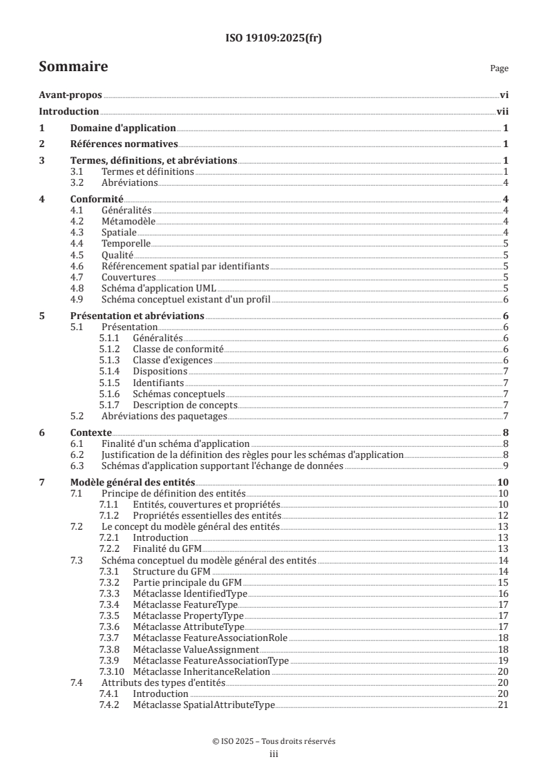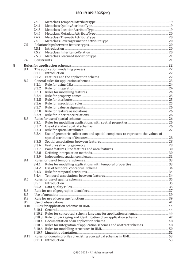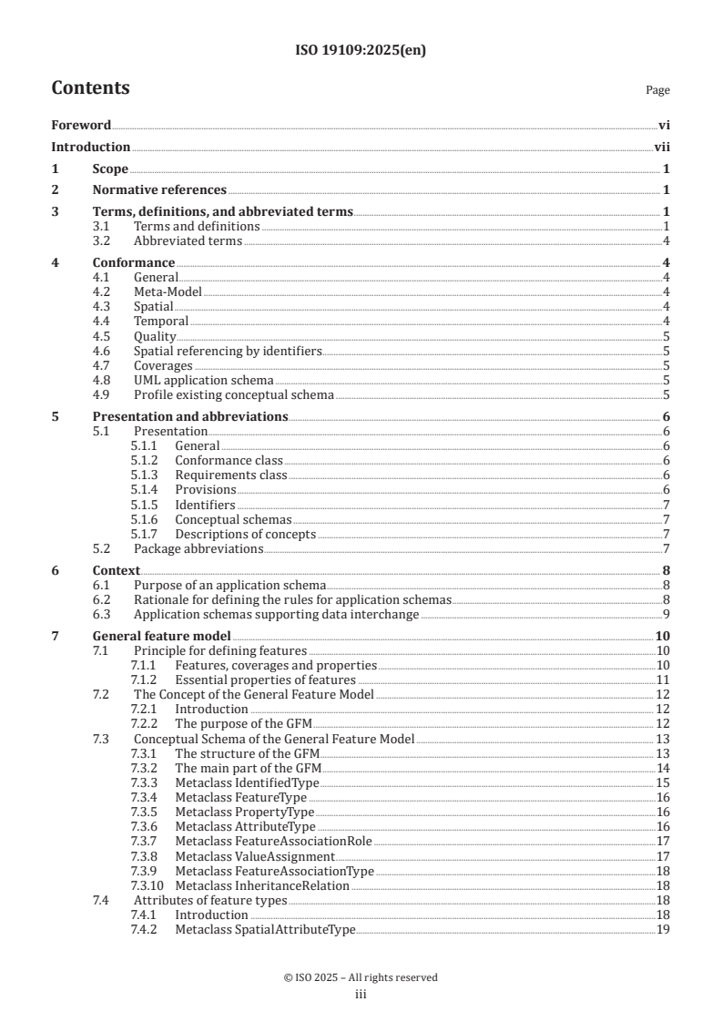 ISO 19109:2025 is a standard published by the International Organization for Standardization (ISO). Its full title is "Geographic information - General feature model and rules for application schema". This standard covers: This document defines the General Feature Model (GFM) as the metamodel for creating application schemas in the context of geo-information modelling. The GFM is explained and implemented as rules for creating and documenting application schemas, including principles for the definition of features. This document is applicable to: - conceptual modelling of features and their properties from a universe of discourse; - definition of application schemas; - general rules for using a conceptual schema language for application schemas; - rules for application schemas using UML as the conceptual schema language; - transition from the concepts in the conceptual model to the data types in the application schema; - integration of standardized schemas from other ISO geographic information standards with the application schema. This document does not apply to: - choice of one particular conceptual schema language for application schemas; - definition of any particular application schemas; - representation of feature types and their properties in a feature catalogue; - representation of metadata; - rules for mapping one application schema to another; - implementation of the application schema in a computer environment; - computer system and application software design; - programming.