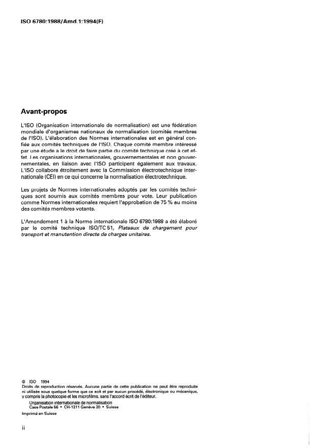 ISO 6780:1988/Amd 1:1994 is a standard published by the International Organization for Standardization (ISO). Its full title is "General-purpose flat pallets for through transit of goods — Principal dimensions and tolerances — Amendment 1". This standard covers: Contains amendments to ISO 6780-1988, which specifies overall dimensions for single-deck and double-deck non-reversible pallets for through transit of goods, and dimensions related to their handling by pallet trucks, fork lift trucks and other appropriate handling equipment.