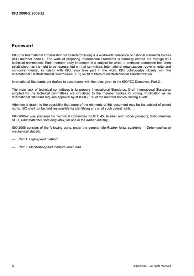 ISO 2006-2:2009 is a standard published by the International Organization for Standardization (ISO). Its full title is "Rubber latex, synthetic — Determination of mechanical stability — Part 2: Moderate-speed method under load". This standard covers: ISO 2006-2:2009 specifies a method for the determination of the mechanical stability of synthetic rubber latex. This method measures the mass of coagulum formed when a test portion of latex is stirred for a specified length of time at moderate speed under a relatively high shear stress achieved by applying a load.