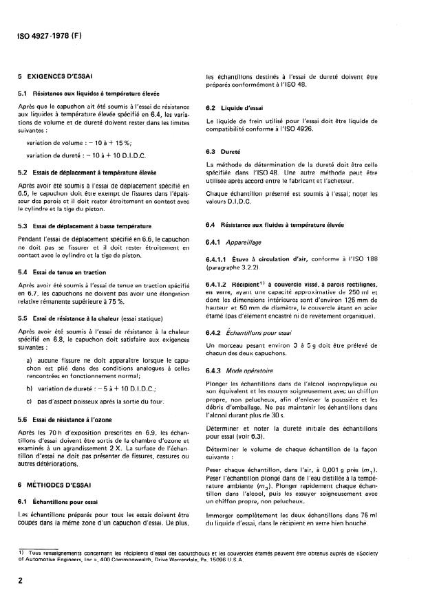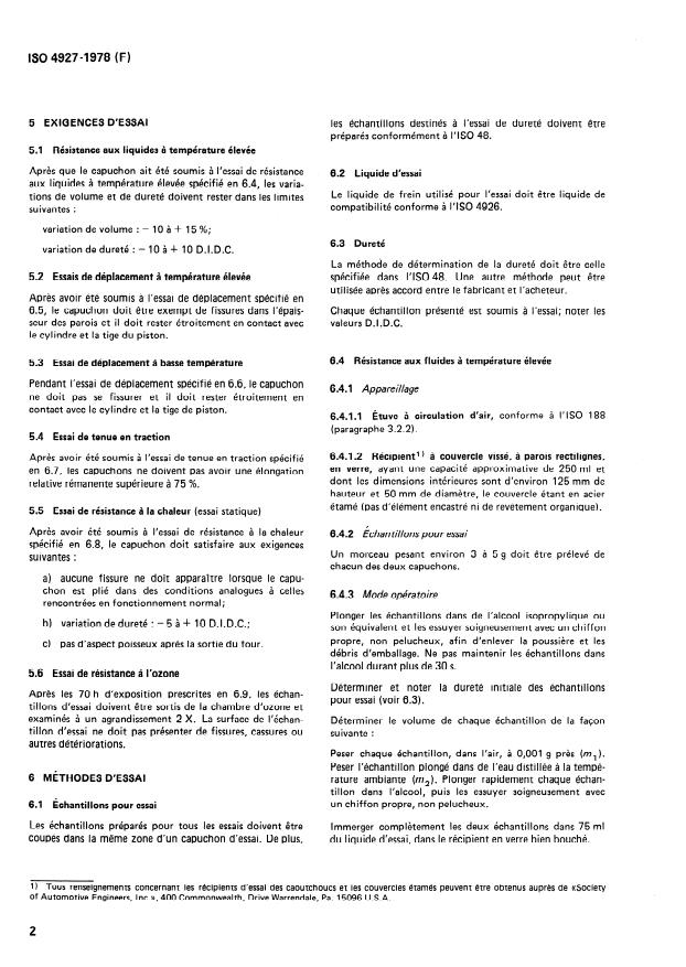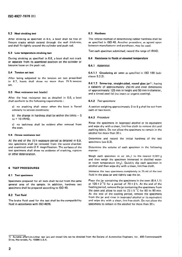 ISO 4927:1978 is a standard published by the International Organization for Standardization (ISO). Its full title is "Road vehicles — Elastomeric boots for drum type hydraulic brake wheel cylinders using a non-petroleum base hydraulic brake fluid (Service temperature 120 degrees C maximum)". This standard covers: Specifies performance tests for moulded rubber boots used at end closures on drum type brake cylinders. These boots prevent the entrance of dirt and moisture which could cause corrosion and otherwise impair wheel brake operation. Applies to boots of both plain and reinforcement insert types. Requirements relating to chemical composition, tensile strength or elongation at break of the rubber compound are not included.