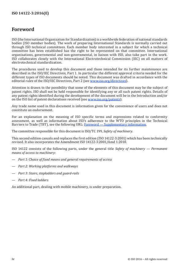 ISO 14122-3:2016 is a standard published by the International Organization for Standardization (ISO). Its full title is "Safety of machinery - Permanent means of access to machinery - Part 3: Stairs, stepladders and guard-rails". This standard covers: ISO 14122-3:2016 gives requirements for non-powered stairs, stepladders and guard-rails which are a part of a stationary machine, and to the non-powered adjustable parts (e.g. foldable, slidable) and movable parts of those fixed means of access. NOTE 1 "Fixed" means of access are those mounted in such a manner (for example, by screws, nuts, welding) that they can only be removed by the use of tools. ISO 14122-3:2016 specifies minimum requirements that also apply when the same means of access is required as the part of the building or civil construction (e.g. stairs, stepladders, guard-rails) where the machine is installed, on condition that the main function of that part of the construction is to provide a means of access to the machine. NOTE 2 Where no local regulation or standards exists, this part of ISO 14122 may be used also for means of access which are outside the scope of the standard. It is intended that this part of ISO 14122 be used with ISO 14122‑1 to give the requirements for steps, stepladders and guard-rails. The ISO 14122 series as a whole is applicable to both stationary and mobile machinery where fixed means of access are necessary. It is not applicable to powered means of access such as lifts, escalators, or other devices specially designed to lift persons between two levels. ISO 14122-3:2016 is not applicable to machinery manufactured before the date of its publication.