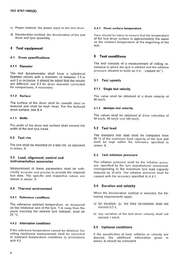 ISO 8767:1992 is a standard published by the International Organization for Standardization (ISO). Its full title is "Passenger car tyres — Methods of measuring rolling resistance". This standard covers: Specifies the following test methods for new pneumatic tyres: force method, torque method, power method, deceleration method. Annex A considers test equipment tolerances, Annex B optional test conditions, Annex C measurement methods of moment of inertia for drum and tyre assembly for the deceleration method.