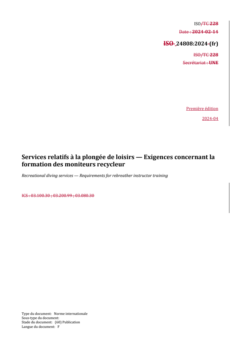 REDLINE ISO 24808:2024 - Services relatifs à la plongée de loisirs — Exigences concernant la formation des moniteurs recycleur Released:4/17/2024