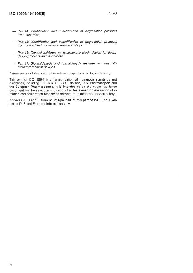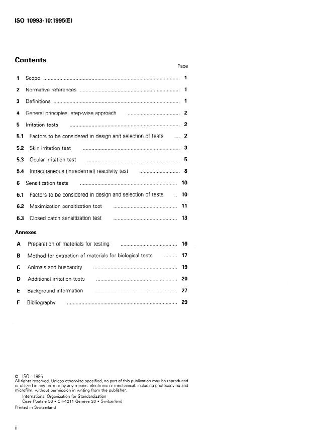 ISO 10993-10:1995 is a standard published by the International Organization for Standardization (ISO). Its full title is "Biological evaluation of medical devices - Part 10: Tests for irritation and sensitization". This standard covers: Describes test methods to evaluate the potential of devices and their constituent materials to produce irritation and to produce sensitization. Also gives guidance for the preparation of materials specifically in relation to the above tests.