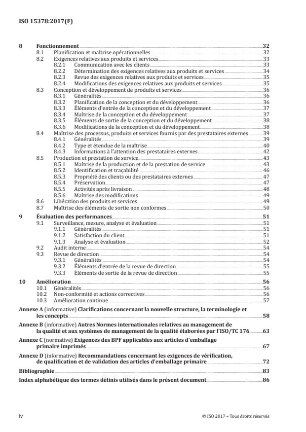 L'ISO 15378 :2017 spécifie les exigences relatives au système de management de la qualité lorsqu'un organisme: a) doit démontrer son aptitude à fournir constamment des produits et des services conformes aux exigences des clients et aux exigences légales et réglementaires applicables, et b) vise à accroître la satisfaction de ses clients par l'application efficace du système, y compris les processus pour l'amélioration du système et l'assurance de la conformité aux exigences des clients et aux exigences légales et réglementaires applicables. Toutes les exigences de l'ISO 15378 :2017 sont génériques et prévues pour s'appliquer à tout organisme, quels que soient son type ou sa taille, ou les produits et services qu'il fournit. NOTE 1 Dans l'ISO 15378 :2017, les termes «produit» ou «service» s'appliquent uniquement aux produits et services destinés à, ou exigés par, un client. NOTE 2 L'expression «legal requirement» recouvre en anglais le concept, utilisé dans l'ISO 15378 :2017, d'exigence légale et réglementaire. En complément de l'ISO 9001, le présent document spécifie les exigences des Bonnes Pratiques de Fabrication (BPF) applicables aux articles d'emballage primaire pour un système de management de la qualité lorsqu'un organisme doit démontrer son aptitude à fournir des articles d'emballage primaire pour médicaments satisfaisant en permanence aux exigences des clients, y compris les exigences réglementaires et les Normes internationales. Dans le présent document, l'expression «si approprié» est utilisée plusieurs fois. Lorsqu'une exigence est qualifiée par cette expression, elle est réputée «appropriée» à moins que l'organisme ne puisse documenter une justification contraire. Le présent document est une norme d'application destinée à la conception, à la fabrication et à la fourniture d'articles d'emballage primaire pour médicaments.