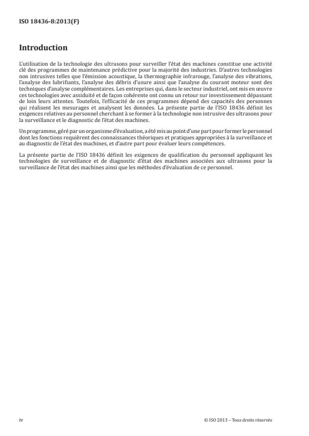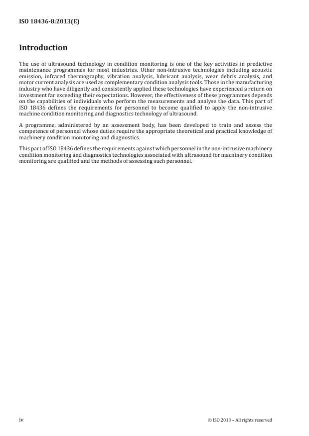 ISO 18436-8:2013 specifies the requirements for qualification and assessment of personnel who perform machinery condition monitoring and diagnostics using ultrasound. A certificate or declaration of conformity to ISO 18436-8:2013 provides recognition of the qualifications and competence of individuals to perform ultrasound measurements and analysis for machinery condition monitoring using ultrasound equipment. It is possible that this procedure is not applicable to specialized equipment or other specific situations. ISO 18436-8:2013 specifies a three-category classification programme that is based on the technical areas delineated herein, consistent with ISO 18436-1 and ISO 18436-3.