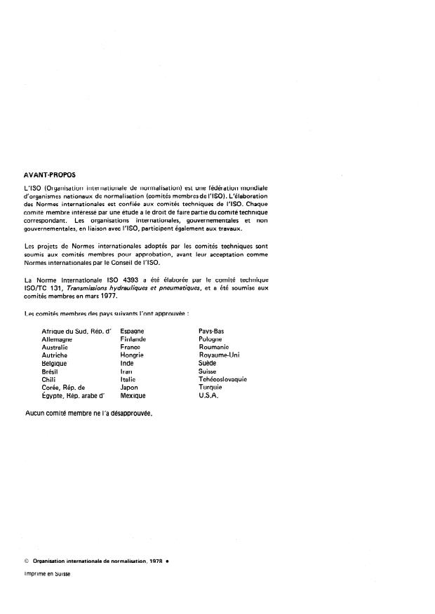 ISO (the International Organization for Standardization) is a worldwide federation of national Standards institutes (ISO member bodies). The work of developing International Standards is carried out through ISO technical committees. Every member body interested in a subject for which a technical committee has been set up has the right to be represented on that committee. International organizations, governmental and non-governmental, in liaison with ISO, also take part in the.work. Draft International Standards adopted by the technical committees are circulated to the member bodies for approval before their acceptance as International Standards by the ISO Council. International Standard ISO 4393 was developed by Technical Committee lSO/TC 131, Fluid power Systems and components, and was circulated to the member bodies in March 1977. lt has been approved by the member bodies of the following countries : Australia Germany Austria Hungary Belgium India grazil Iran Chile Italy Czechoslovakia Japan Egypt, Arab Rep. of Korea, Rep. of Finland Mexico France Netherlands Poland Romania South Africa, Rep. of Spain Sweden Switzerland Turkey h)nited Kingdom U .S.A. No member body expressed disappr