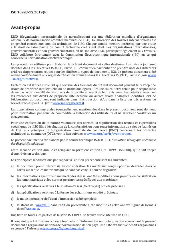 ISO 10993-15:2019 is a standard published by the International Organization for Standardization (ISO). Its full title is "Biological evaluation of medical devices - Part 15: Identification and quantification of degradation products from metals and alloys". This standard covers: Le présent document spécifie les exigences générales pour la conception des essais d'identification et de quantification des produits de dégradation issus de dispositifs médicaux métalliques finaux ou d'échantillons des matériaux correspondants prêts pour une utilisation clinique. Le présent document ne s'applique qu'aux produits de dégradation créés par une modification chimique du dispositif métallique final et au moyen d'un essai de dégradation in vitro. En raison de la nature des essais in vitro, les résultats d'essai donnent une approximation du comportement in vivo de l'implant ou du matériau. En raison du caractère accéléré de ces essais, la méthodologie chimique décrite est un moyen de générer des produits de dégradation en vue d'analyses ultérieures. Le présent document s'applique aux matériaux conçus pour se dégrader dans le corps, ainsi qu'aux matériaux qui ne sont pas conçus pour se dégrader. Le présent document n'est pas applicable à l'évaluation de la dégradation qui se produit uniquement suite à des processus mécaniques; les méthodologies de génération de ce type de produit de dégradation sont décrites, le cas échéant, dans les normes des produits considérés. NOTE La dégradation purement mécanique donne principalement de la matière sous forme de particules. Bien qu'ils n'entrent pas dans le domaine d'application du présent document, de tels produits de dégradation peuvent entraîner une réponse biologique et peuvent subir une évaluation biologique telle que celle décrite dans les autres parties de l'ISO 10993. En raison de la grande variété des matériaux métalliques utilisés dans la fabrication des dispositifs médicaux, la présente partie de l'ISO 10993 n'indique aucune technique d'analyse spécifique pour la quantification des produits de dégradation. Le présent document ne traite pas de l'identification d'éléments à l'état de trace (−6 w/w) contenus dans le métal ou l'alliage analysé. Il ne fournit aucune exigence spécifique relative aux niveaux admissibles de produits de dégradation. Le présent document ne couvre pas l'activité biologique des produits de dégradation (pour cela, voir les articles correspondants de l'ISO 10993-1 et de l'ISO 10993-17).