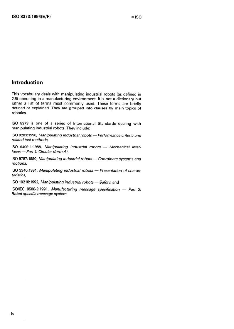 ISO 8373:1994 is a standard published by the International Organization for Standardization (ISO). Its full title is "Manipulating industrial robots — Vocabulary". This standard covers: Defines terms relevant to manipulating industrial robots operated in a manufacturing environment.