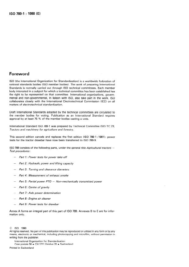 ISO 789-1:1990 - Agricultural tractors -- Test procedures