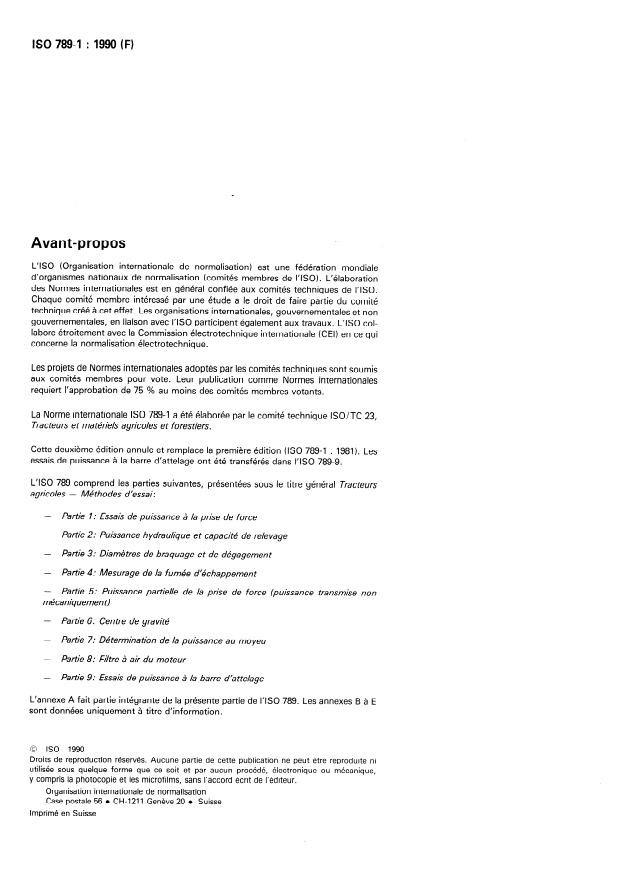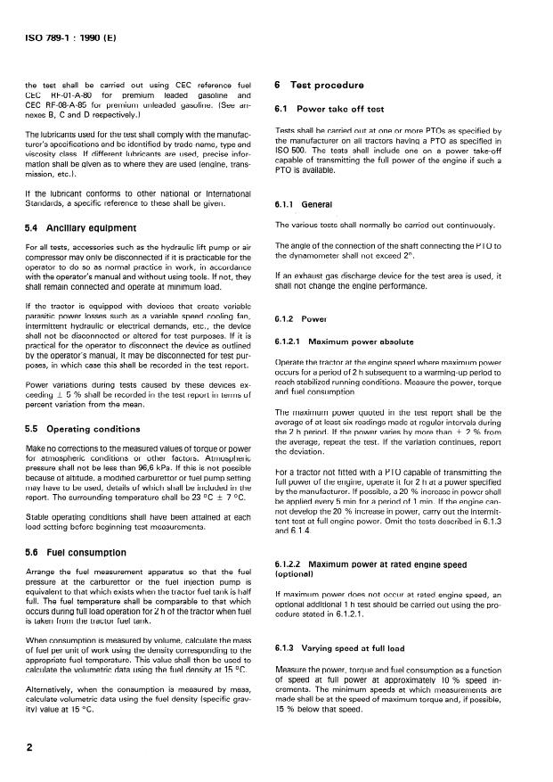 ISO 789-1:1990 is a standard published by the International Organization for Standardization (ISO). Its full title is "Agricultural tractors — Test procedures — Part 1: Power tests for power take-off". This standard covers: This part is the first of a series of eight. Specifies procedure for determining the power available at the power take-off, drawbar and belt pulley on tractors. Contains definitions and permissible measurement tolerances. Annex A includes a specimen test report. The measurement of tyre tread is given in annex B.