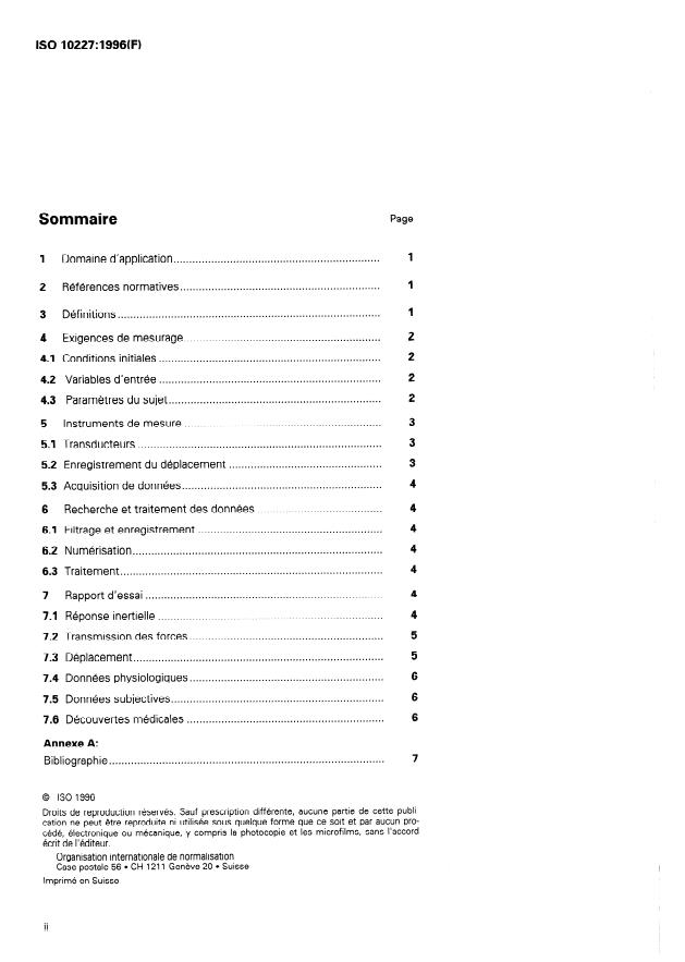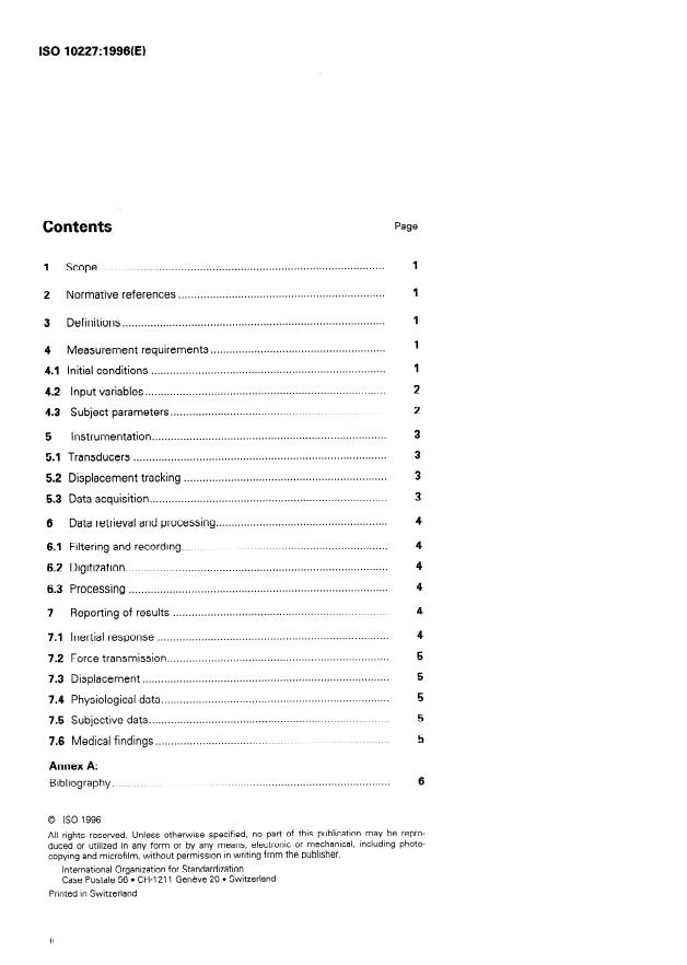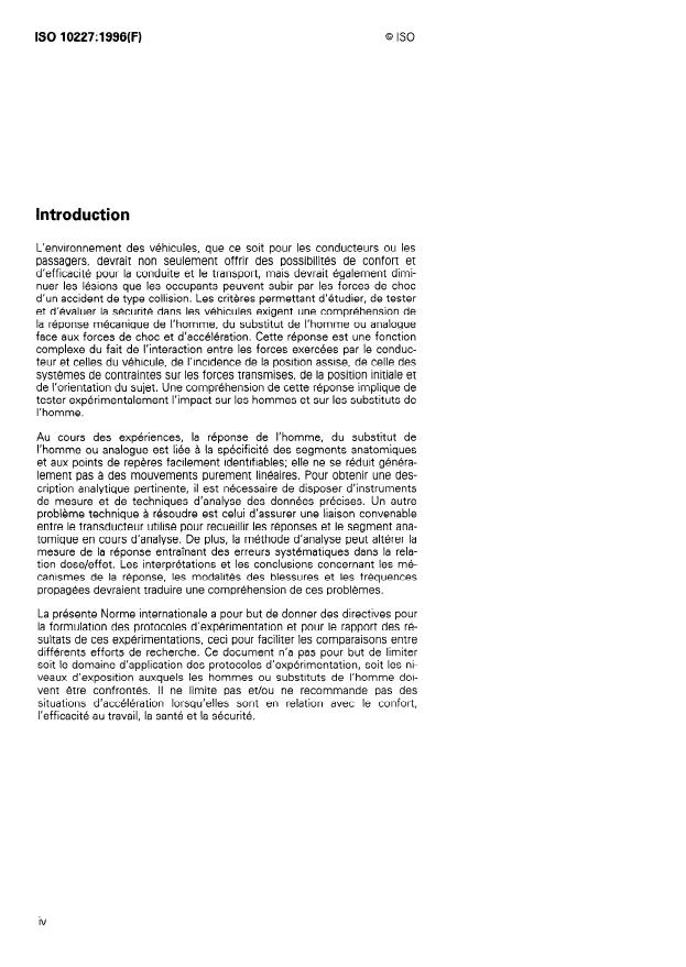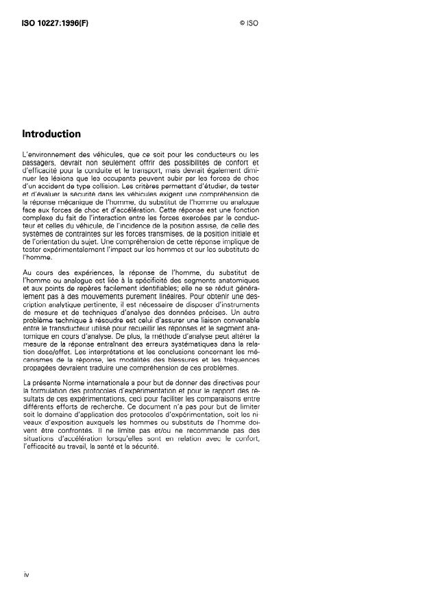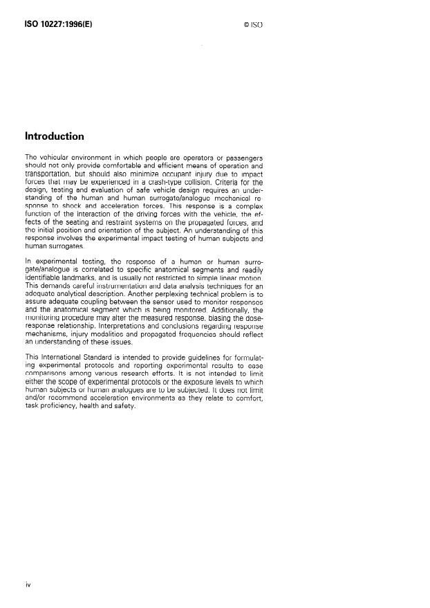 ISO 10227:1996 focuses exclusively on indirect (inertial) single shock impacts affecting the human body or surrogates, excluding direct surface impacts and active restraint systems like airbags. It serves as a guideline for experimental protocols and data reporting rather than prescribing exposure limits or test conditions.Measurement Requirements
