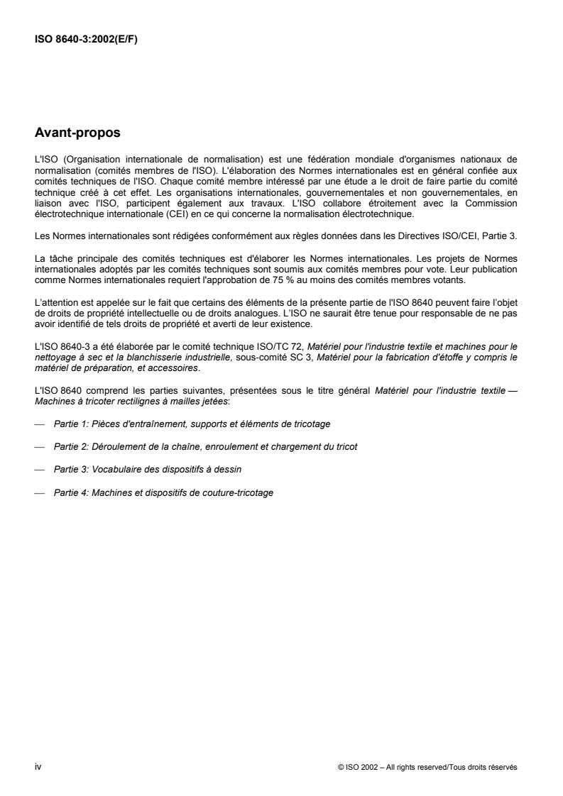 ISO 8640-3:2002 is an International Organization for Standardization (ISO) vocabulary standard that defines the terminology for patterning devices used on flat warp knitting machines. It is part of the ISO 8640 series covering flat warp knitting machinery and accessories. The standard clarifies names and definitions for components such as lapping devices, patterning presser devices, fall-plate patterning, yarn let-off and tensioning patterning devices, needle-bar stopping devices, weft insertion devices and take-up patterning devices.