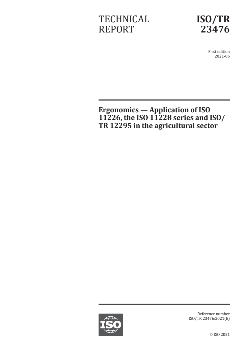 ISO/TR 23476:2021 - Ergonomics — Application of ISO 11226, the ISO 11228 series and ISO/TR 12295 in the agricultural sector Released:6/16/2021