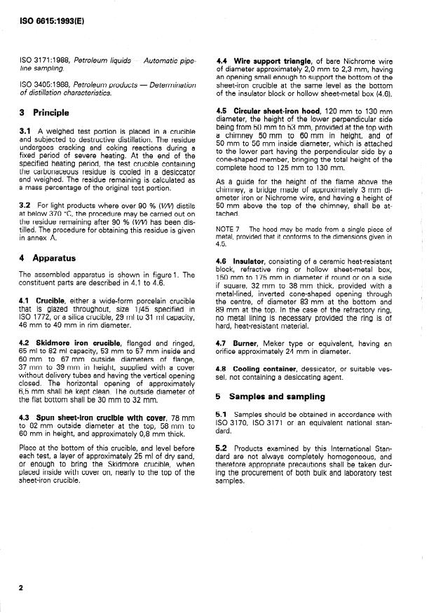 INTERNATIONAL STANDARD ISO 6615:1993(E) Petroleum products - Determination of carbon residue - Conradson method WARNING - The use of this International Standard may involve hazardous materials, operations and equipment. This International Standard does not purport to address all of the safety Problems associated with its use. lt is the responsibility of the User of this International Standard to establish appropriate safety and health practices and determine the applicability of regulatory limitations Prior to use. 1 Scope This International Standard specifies a method for determining the amount of carbon residue, in the range of 0,Ol % (m/m) to 30,O % (m/m), left after evaporation and pyrolysis of an Oil, and is intended to provide some indication of relative Coke-forming tendency. The method is generally applicable to rela- tively non-volatile Petroleum products which partially decompose on distillation at atmospheric pressure. Petroleum products containing ash-forming constitu- ents as determined by ISO 6245 will exhibit an erro- neously high carbon residue, depending upon the amount of ash formed. NOTES 1 The term “carbon residue” is used throughout this In- ternational Standard to designate the carbonaceous residue formed after evaporation and pyrolysis of a petroleum product. The residue is not entirely composed of carbon, but is a coke which tan be further changed by pyrolysis. The term “carbon residue” is retained in this method only in deference to its widespread use. 2 Values obtained by this method are not numerically the same as those obtained by ISO 4262, nor have satisfactory correlations been found between the results obtained by the two methods for all materials which may be tested, because the carbon residue test is applied to a wide variety of Petroleum products. The Conradson carbon residue is finding use to characterize heavy residue fuel, coker feed Stocks, etc., which cannot readily be Ioaded into a Ramsbottom coker bulb, and when it is desirable to exam- ine or further test the residue. ISO 10370 (micro method) gives results similar to this method on a wide range of pet- roleum products, and may in time replace both this method and ISO 4262. 3 The carbon residue of distillate and residual fuel oils gives an approximate ranking of such fuels in terms of their propensity to form deposits in specific applications. 4 The presence of alkyl nitrates in distillate fuels, or ash- forming additives in either distillate or residue fuels, will give carbon residue results that are higher than the correspond- ing values on the fuel without additives. These values may not correlate with the propensity of a fuel to form deposits. 5 The carbon residue of base lubricating oils may give an indication of the propensity of the oil to lay down deposits in combustion chambers, and/or of the relative Chemical constitution of oils of similar viscosity. Most finished lubri- cating oils contain ash-forming additives, and thus the car- bon residue of finished lubricants cannot be used in this manner. 6 The carbon residue of a gas oil is a useful guide in the manufacture of gas. 2 Normative references The following Standards contain provisions which, through reference in this text, constitute provisions of this International Standard. At the time of publi- cation, the editions indicated were valid. All Standards are subject to revision, and Parties to agreements based on this International Standard are encouraged to investigate the possibility of applying the most re- cent editions of the Standards indicated below. Members of IEC and ISO maintain registers of cur- rently valid International Standards. ISO 1772:1975, Laboratory crucibles in porcelain and silica. \ ISO 3170:1988, Petroleum liquids - Manual sampling. SIST ISO 6615:1996