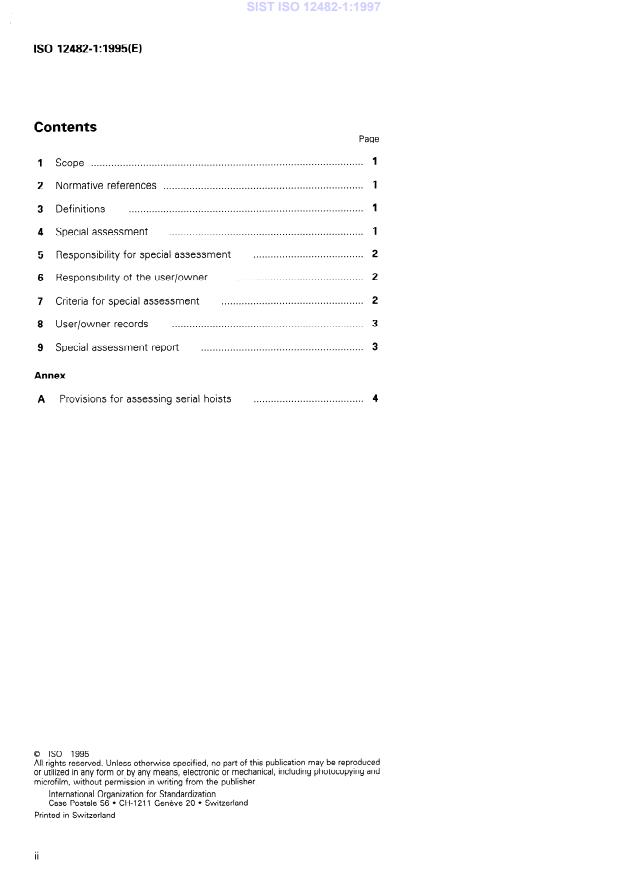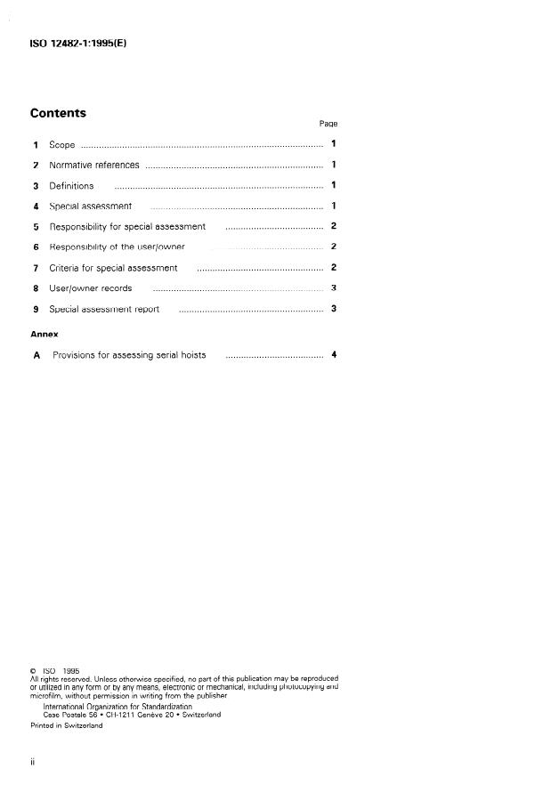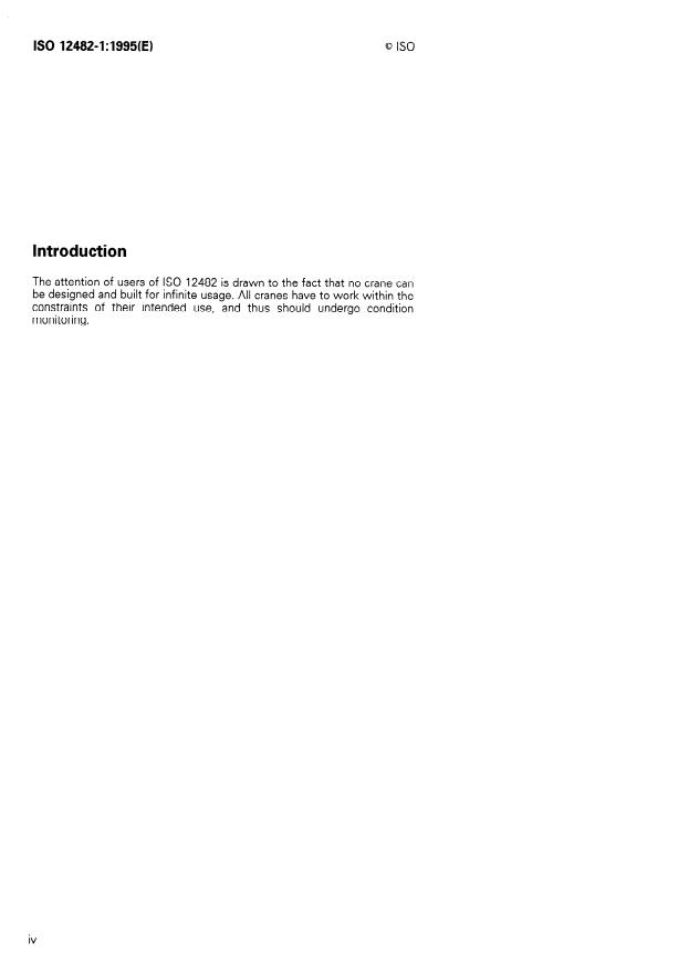 ISO 12482-1:1995 is a standard published by the International Organization for Standardization (ISO). Its full title is "Cranes — Condition monitoring — Part 1: General". This standard covers: Purpose of this part is to ensure that the design constraints of the intended use of a crane are clearly identified and to define actions to be taken when the crane has been used over a period of time and has approached these constraints, to ensure a new safe working period. A description is given of the special assessment required to monitor the condition of a crane.