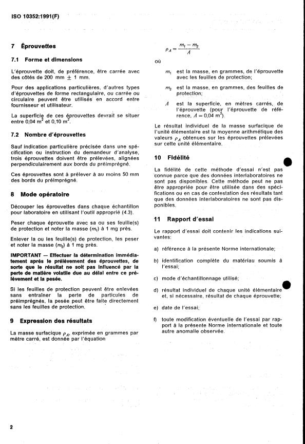 ISO 10352:1991 - Plastiques renforcés de fibres -- Préimprégnés -- Détermination de la masse surfacique