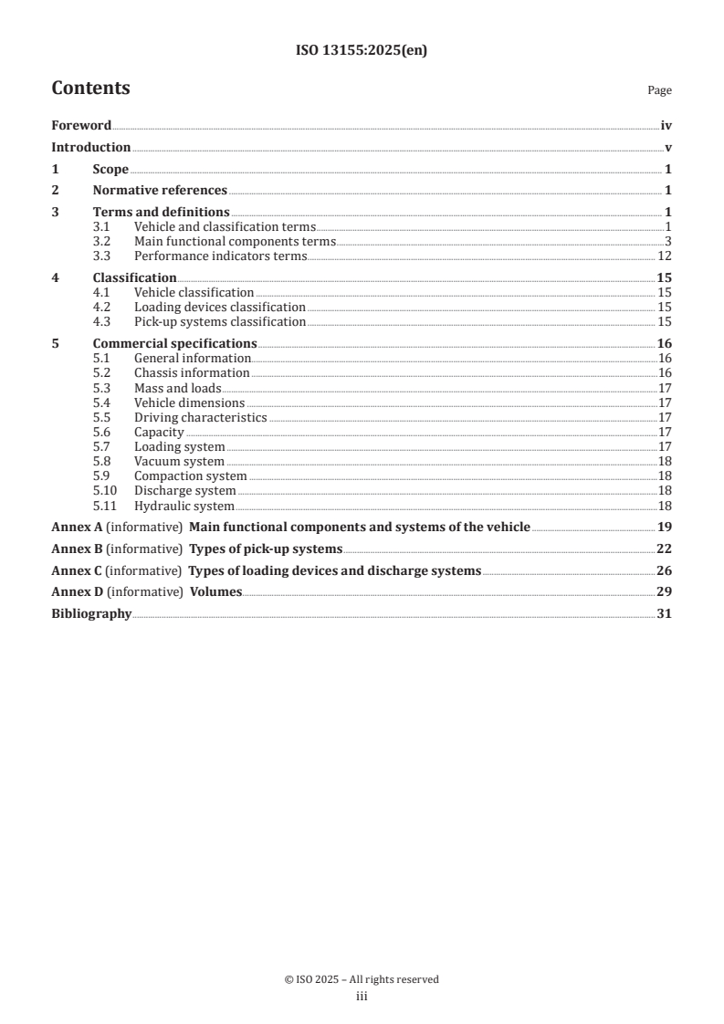 This document defines the basic terms of functional components and performance indicators commonly used in the area of refuse collection vehicles (RCV). This document also gives classification and requirements for commercial specifications for RCVs. It aims to align with terminology that are used internationally. This standard provides further vocabulary to those defined in ISO 24161. NOTE ‘Refuse’ and ‘waste’ are used interchangeably in this document.