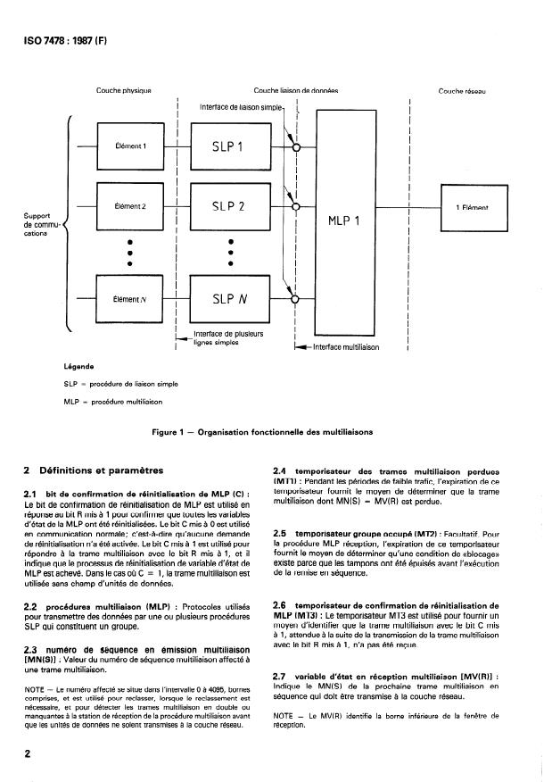 ISO 7478:1987, "Information processing systems - Data communication - Multilink procedures," defines multilink procedures (MLP) at the data link layer for aggregating multiple parallel physical or logical links (Single Link Procedures, SLPs) into a single variable‑bandwidth logical data link. The standard describes frame formats, control bits, sequence numbering and timers needed to provide resequencing, load sharing, graceful degradation and retransmission management across a multilink group. It sits above SLPs and below the network layer in the OSI layering model.