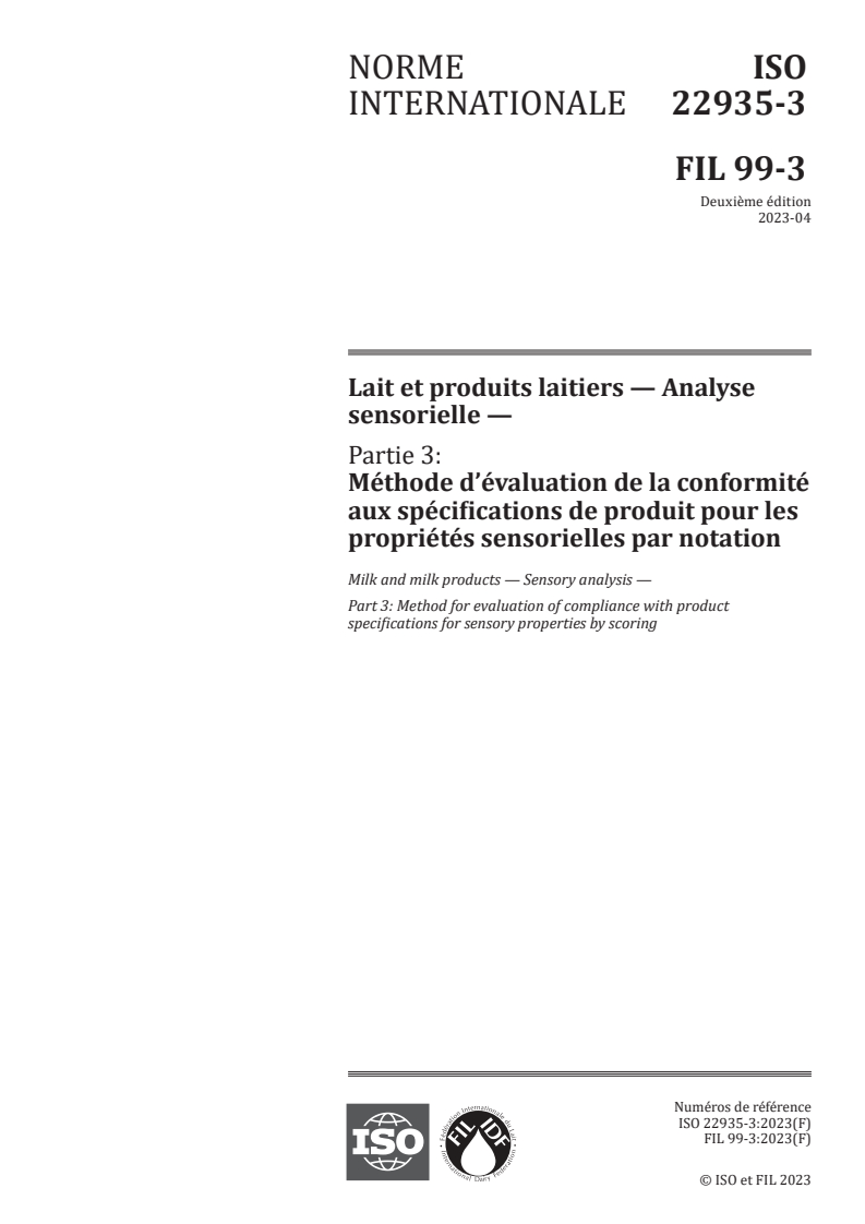Keywords: ISO 22935-3:2023, sensory analysis, milk and milk products, sensory scoring, product specifications, quality control, sensory panel, nomenclature of terms.