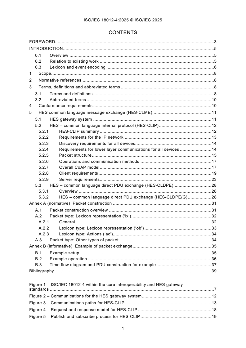 - Conformance and communication requirements: Includes conformance requirements, discovery, lower-layer communication requirements, packet structure, and operation modes (request/response, publish/subscribe).
