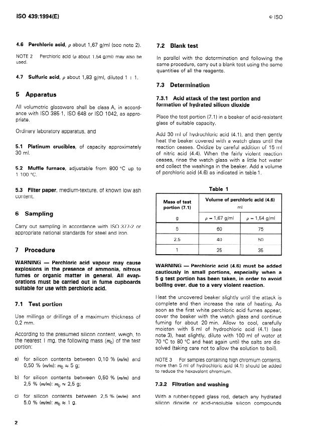 ISO 439:1994 is a standard published by the International Organization for Standardization (ISO). Its full title is "Steel and iron — Determination of total silicon content — Gravimetric method". This standard covers: The document specifies a gravimetric method for the determination of the total silicon content in steel and iron. The method is apllicable to silicon contents between 0,10 % (m/m) and 5,0 % (m/m). For samples containing molybdenum, niobium, tantalum, titanium, tungsten, zirconium or high levels of chromium, the result are less precise than for unalloyed steels.