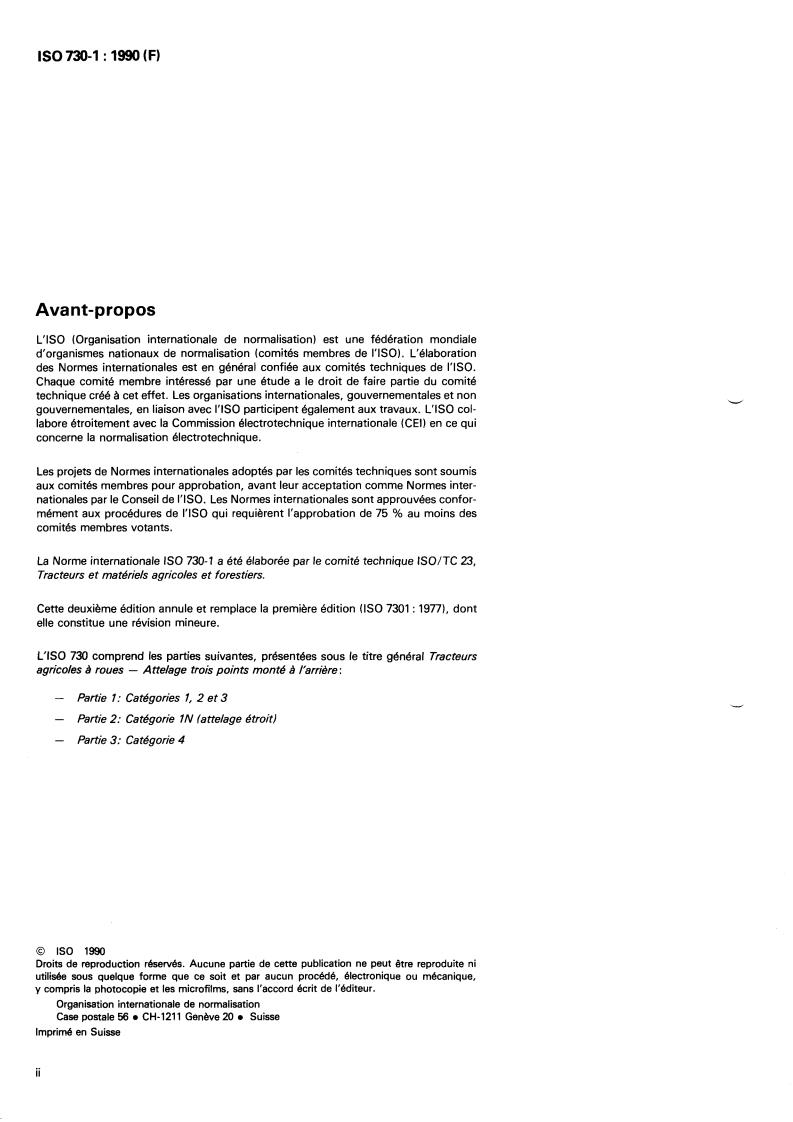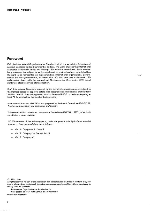 ISO 730-1:1990 is a standard published by the International Organization for Standardization (ISO). Its full title is "Agricultural wheeled tractors — Rear-mounted three-point linkage — Part 1: Categories 1, 2 and 3". This standard covers: Agricultural wheeled tractors — Rear-mounted three-point linkage — Part 1: Categories 1, 2 and 3