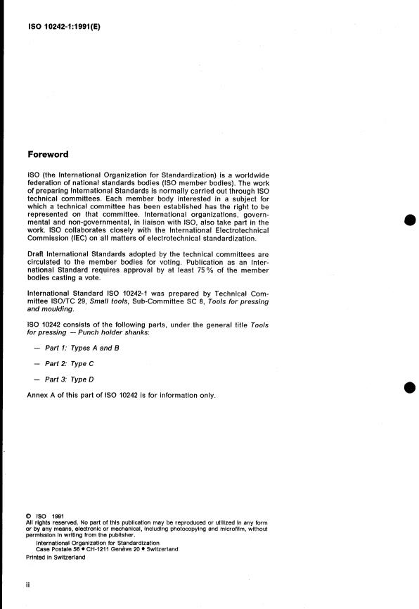 ISO 10242-1:1991 is a standard published by the International Organization for Standardization (ISO). Its full title is "Tools for pressing — Punch holder shanks — Part 1: Types A and B". This standard covers: Tools for pressing — Punch holder shanks — Part 1: Types A and B