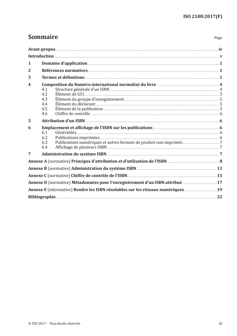 ISO 2108:2017 a pour objet d'établir les spécifications faisant du Numéro international normalisé du livre (ISBN) un système d'identification international unique pour chaque format de produit ou édition d'une monographie mise à disposition séparément, publiée ou produite par un éditeur en particulier, qui est mise à la disposition du public. Elle spécifie la composition d'un ISBN, les règles pour son attribution et son utilisation, les métadonnées devant être associées à l'attribution de l'ISBN ainsi que l'administration du système ISBN. ISO 2108:2017 est applicable aux monographies (livres), et non aux ?uvres textuelles (contenu). Les monographies comprennent les parties individuelles ou chapitres lorsqu'ils sont mis à disposition séparément et certains types de produits connexes mis à la disposition du public, que ce soit à la vente ou gratuitement. L'Annexe A fournit des exemples de produits pour lesquels la norme est ou non applicable. NOTE Des conseils opérationnels plus détaillés sont fournis dans la dernière version du Manuel d'utilisation, disponible auprès de l'Autorité d'enregistrement pour le présent document (voir Article 7).
