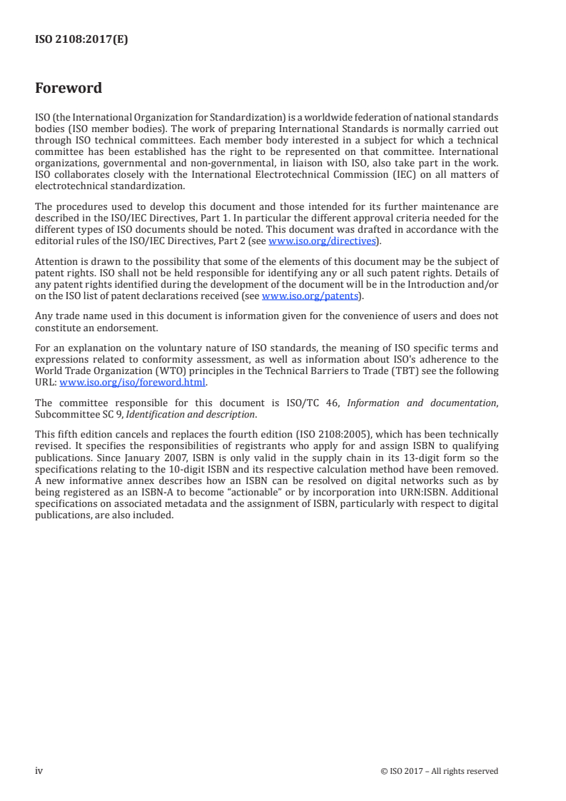 ISO 2108:2017 is a standard published by the International Organization for Standardization (ISO). Its full title is "Information and documentation — International Standard Book Number (ISBN)". This standard covers: ISO 2108:2017 establishes the specifications for the International Standard Book Number (ISBN) as a unique international identification system for each product form or edition of a separately available monographic publication published or produced by a specific publisher that is available to the public. It specifies the construction of an ISBN, the rules for its assignment and use, the metadata to be associated with the ISBN allocation, and the administration of the ISBN system. ISO 2108:2017 is applicable to monographic publications (books), not to textual works (content). Monographic publications include individual sections or chapters where these are made separately available and certain types of related products that are available to the public irrespective of whether those publications are made available for sale or on a gratis basis. Examples of applicable and non-applicable products are provided in Annex A. NOTE More detailed, operational guidance is provided in the latest version of the Users' Manual available from the Registration Authority for this document (see Clause 7).