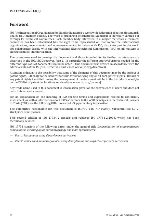 ISO 17734-2:2013 is a standard published by the International Organization for Standardization (ISO). Its full title is "Determination of organonitrogen compounds in air using liquid chromatography and mass spectrometry — Part 2: Amines and aminoisocyanates using dibutylamine and ethyl chloroformate derivatives". This standard covers: ISO 17734-2:2013 gives general guidance for the sampling and analysis of airborne amines and aminoisocyanates in workplace air. It is strongly recommended that the determination of amines and aminoisocyanates is made together with the determination of isocyanates in air, using DBA as a reagent (see ISO 17734-1). The method can be used for simultaneous determinations of amines, such as 4,4'-methylenediphenyldiamine (4,4'-MDA), 2,4- and 2,6-toluenediamine (2,4- and 2,6-TDA), and 1,6-hexamethylenediamine (1,6-HDA), and compounds containing both isocyanate and amine groups, such as 4,4'-methylenediphenyl aminoisocyanate (4,4'-MAI), 2,4-, 4,2-, and 2,6-toluene aminoisocyanate (2,4-, 4,2-, and 2,6-TAI), and 1,6-hexamethylene aminoisocyanate (1,6-HAI). The method is suitable for collecting amines and aminoisocyanates in both the gas and particle phases. The instrumental detection limit for the amines is about 5 nmol/sample and for the aminoisocyanate, it is about 0,3 nmol/sample. For a 15 l air sample, this corresponds to 0,4 ng⋅m?3 for TDA and 0,03 ng⋅m?3 for TAI.