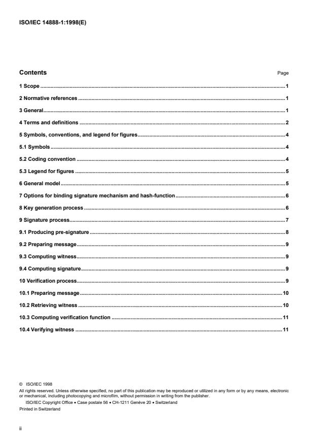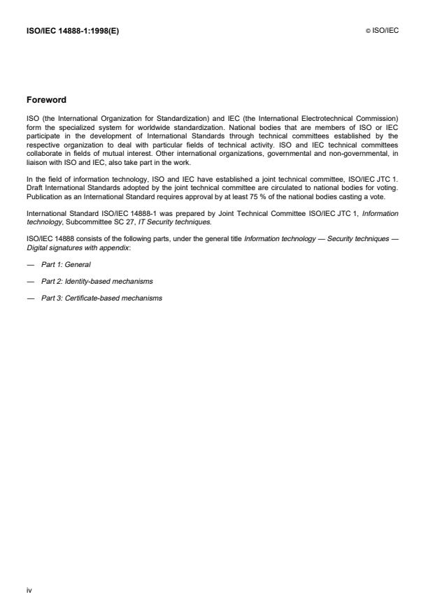 ISO/IEC 14888-1:1998 is a standard published by the International Organization for Standardization (ISO). Its full title is "Information technology — Security techniques — Digital signatures with appendix — Part 1: General". This standard covers: Information technology — Security techniques — Digital signatures with appendix — Part 1: General