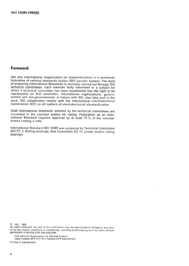 ISO 10285:1992 is a standard published by the International Organization for Standardization (ISO). Its full title is "Rolling bearings, linear motion, recirculating ball, sleeve type — Metric series". This standard covers: Specifies the general boundary dimensions, tolerances and definitions. Applies only to the size range given in table 1 (bore diameters from 3 mm up to 100 mm).