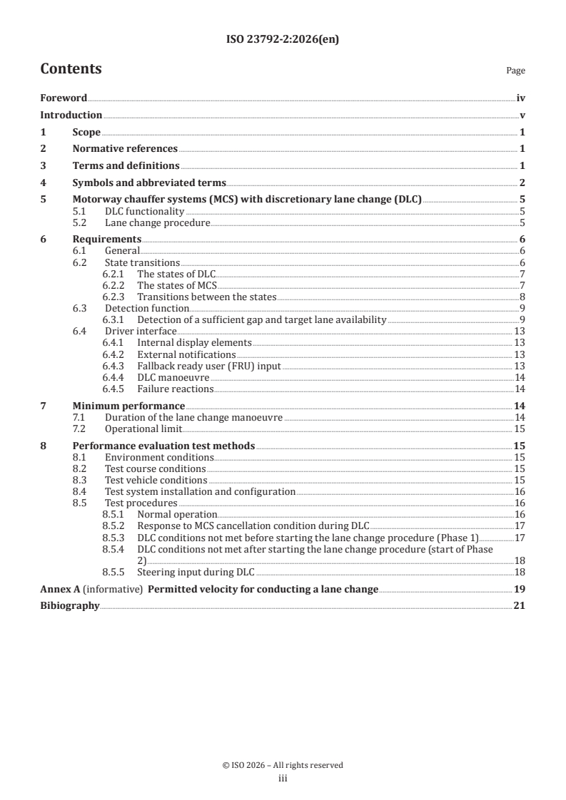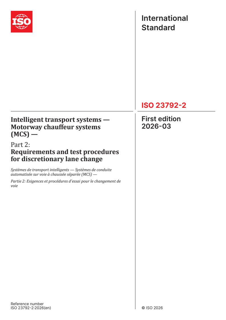 ISO 23792-2:2026 is a standard published by the International Organization for Standardization (ISO). Its full title is "Intelligent transport systems — Motorway chauffeur systems (MCS) — Part 2: Requirements and test procedures for discretionary lane change". This standard covers: This document specifies the requirements for discretionary lane change (DLC) for motorway chauffeur systems (MCS) that perform Level 3 automated driving on limited access motorways. It also specifies the test procedures to verify the requirements. DLC is an additional functionality that can be added to an MCS conforming to the general requirements specified in ISO/TS 23792-1. Means related to setting a destination and selecting a route to reach the destination are not in the scope of this document. This document applies to the system installed in light vehicles.