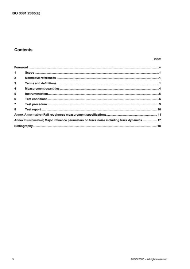 ISO 3381:2005 specifies the conditions for obtaining reproducible and comparable measurement results of levels and spectra of noise inside all kinds of vehicles on rails or other types of fixed track, except for track maintenance vehicles in operation. It is applicable to type testing and periodic monitoring testing. The results may be used, for example, to characterize the noise inside these vehicles and to compare the internal noise of various vehicles on a particular track section. The test procedures specified in this ISO 3381:2005 are of engineering grade (grade 2, with a precision of 2 dB), that is the preferred one for noise declaration purposes, as defined in ISO 12001.