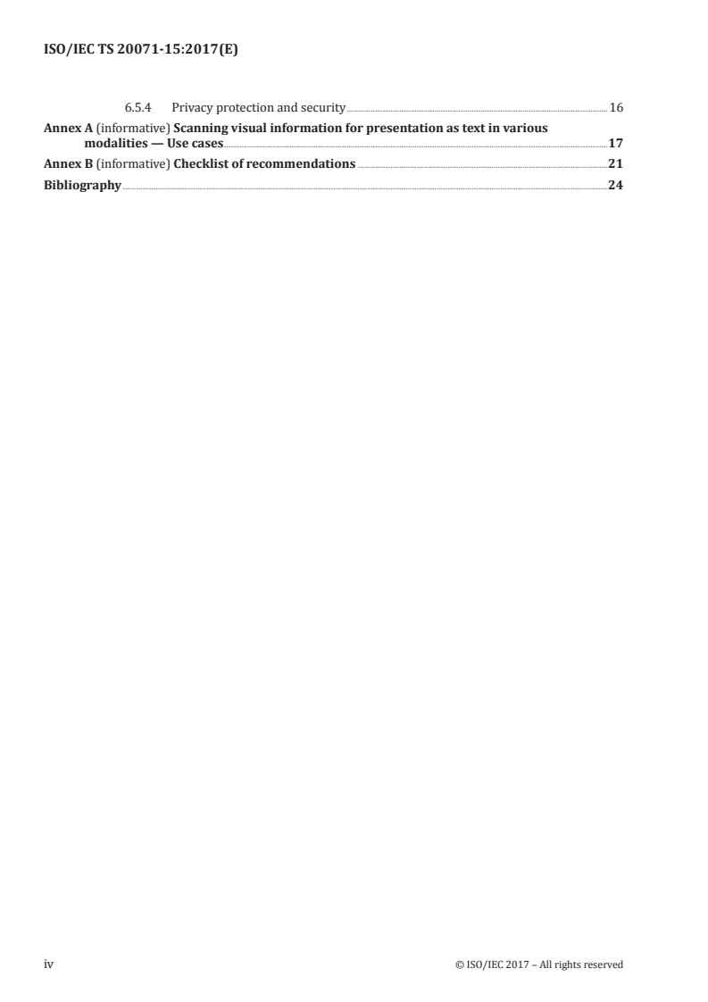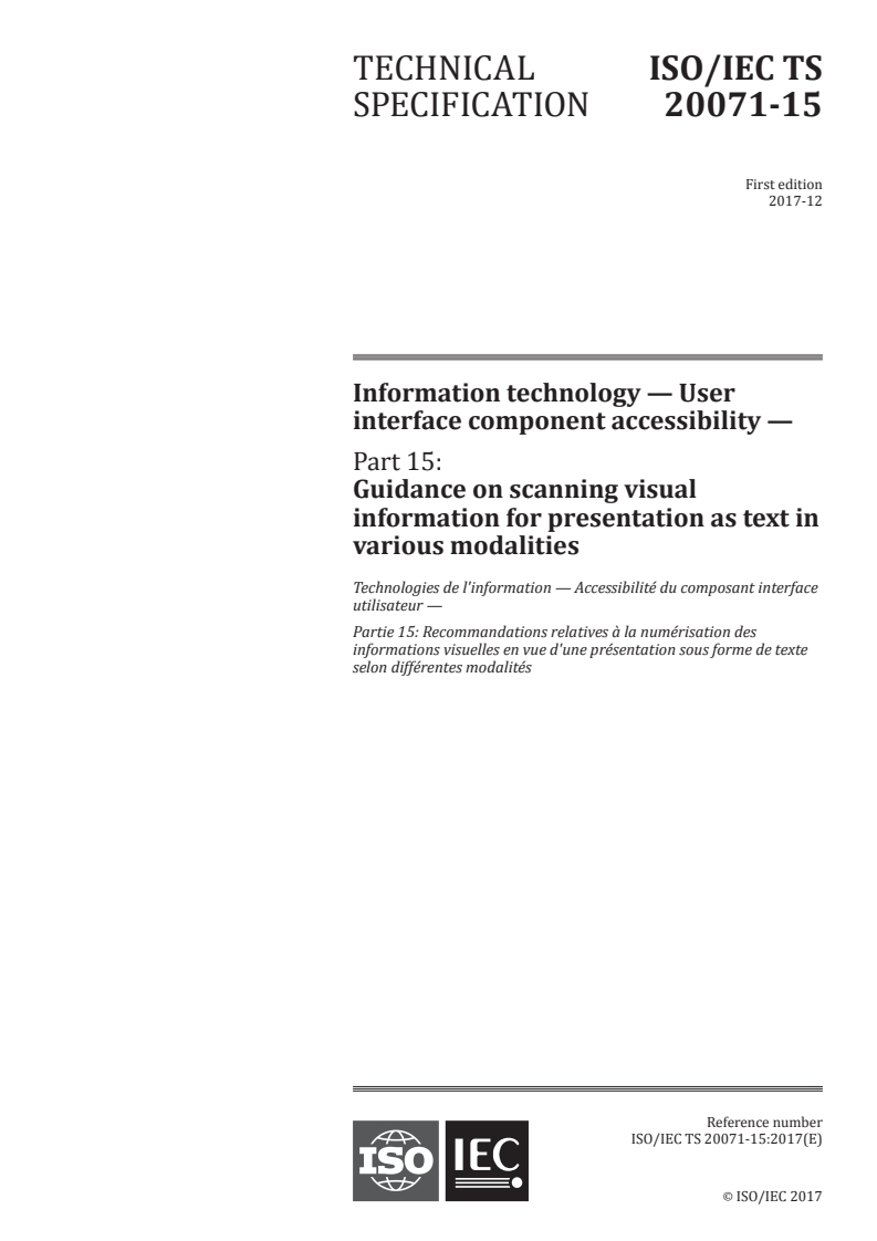 ISO/IEC TS 20071-15:2017 - Information technology — User interface component accessibility — Part 15: Guidance on scanning visual information for presentation as text in various modalities Released:12/8/2017