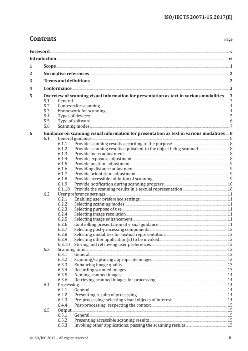 ISO/IEC TS 20071-15:2017 is a technical specification published by the International Organization for Standardization (ISO). Its full title is "Information technology — User interface component accessibility — Part 15: Guidance on scanning visual information for presentation as text in various modalities". This standard covers: ISO/IEC TS 20071-15:2017 provides guidance on various aspects of the user interface of applications that scan visual information that are used directly by humans, including: - initiating the scanning application; - setting user's preferences and configuring the scanning application; - identifying the types of information currently of interest to the user; - locating visual objects of interest to the user; - creating a static image via scanning the visual object; - identifying the information content provided by the visual object; - processing scanned information and outputting the results to the user. ISO/IEC TS 20071-15:2017 provides increased accessibility by addressing the user accessibility needs of diverse users in diverse contexts. ISO/IEC TS 20071-15:2017 contains guidance that can be applied to a variety of devices, including: - specialized devices that are dedicated to scanning and processing visual information; - mobile devices (such as smartphones and tablets); - general purpose computers with camera capabilities; - office machines with scanning functions. ISO/IEC TS 20071-15:2017 contains guidance that can be applied to various types of software, including: - stand-alone scanning applications; - applications including scanning functionalities; - (scanning) applications that interoperate with other applications. ISO/IEC TS 20071-15:2017 contains guidance that can be used for outputting scanned information in various modalities, including: - audio outputs; - visual outputs; - tactile outputs; - storing information for future use within the application performing the scanning; - electronic outputs (to other applications, systems, or devices including those directly connected and those connected via the Internet). ISO/IEC TS 20071-15:2017 does not: - apply to fully automated scanning that is not under direct human control; - apply to applications that scan visual information for editing an image or just displaying it; - provide guidance on the design of specific hardware devices involved in scanning; - provide guidance on the specific objects that can be recognized or the specific software used to recognize these objects; - provide guidance on the internal functioning of software that recognizes specific types of objects. ISO/IEC TS 20071-15:2017 is intended for use by developers of applications that include user controlled scanning functionalities. It does not expect that an application includes all of these functionalities. It can be used for those functionalities that an application does provide.