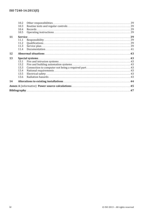 ISO 7240-14:2013 is a standard published by the International Organization for Standardization (ISO). Its full title is "Fire detection and alarm systems — Part 14: Design, installation, commissioning and service of fire detection and fire alarm systems in and around buildings". This standard covers: ISO 7240-14:2013 specifies the design, installation, commissioning, and service requirements for a fire detection and alarm system (FDAS), which is primarily intended to provide early detection of fire and notification within one or more specified indoor or outdoor areas for the protection of lives. The FDAS includes automatic detection of a fire and manual initiation of a fire alarm, with audible and visual warning to people within the detection area. ISO 7240-14:2013 also specifies requirements for FDAS capable of providing signals to audible warning systems in accordance with ISO 7240-19, to initiate the operation of ancillary technical services, such as fixed fire extinguishing systems, and to other precautions and actions. The protection of property is outside the scope of ISO 7240-14:2013. However, the requirements specified herein may be used as recommendations for property protection.