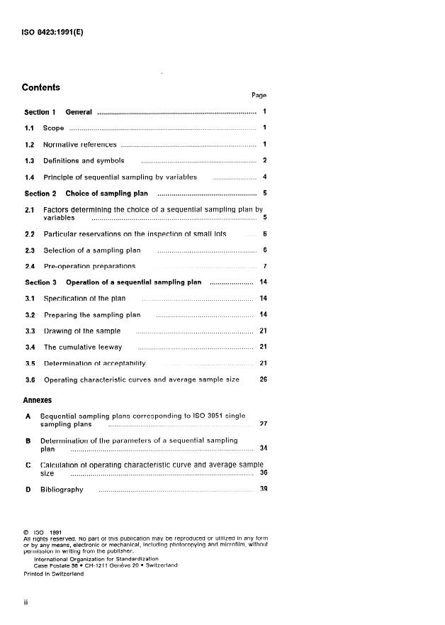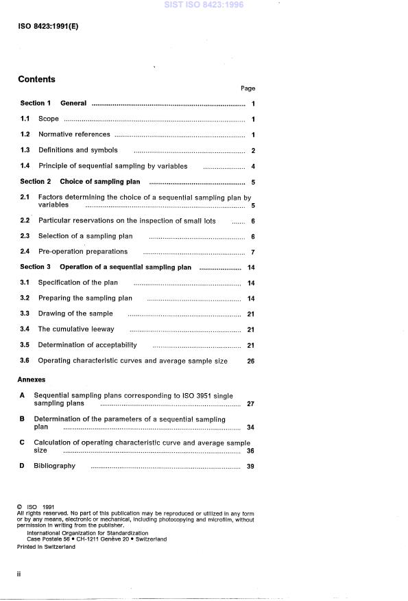 ISO 8423:1991 is a standard published by the International Organization for Standardization (ISO). Its full title is "Sequential sampling plans for inspection by variables for percent nonconforming (known standard deviation)". This standard covers: Applies if all of the following conditions are satisfied: a) inspected are continuing series of lots of discrete items supplied by one producer from one production process; b) only a single quality characteristic x is taken into consideration; c) production is stable and x has a known standard deviation; d) an upper or lower limit (or both) is defined.