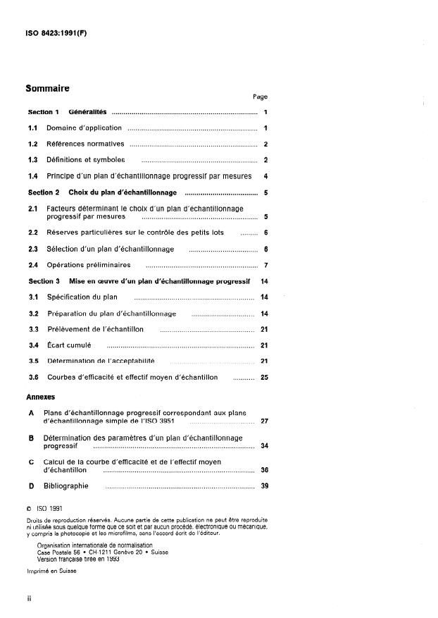 1.1.1 La présente Norme internationale présente des plans et des règles d'échantillonnage progressif pour le contrôle par mesures d'individus discrets. Elle est complémentaire à l'ISO 8422. Les plans du corps principal de la norme sont indexés en termes de point du risque fournisseur et de point du risque client. L'annexe A donne des plans et des règles d'échantillonnage progressif indexés en termes de niveau de qualité acceptable (NQA) en complément du système de plans d'échantillonnage de l'ISO 3951. Le but de la présente Norme internationale est de fournir des règles fondées sur la détermination progressive des résultats de contrôle, afin de persuader le fournisseur, par des pressions économiques et psychologiques de la non-acceptation de lots de qualité inférieure, pour qu'il fournisse des lots de qualité ayant une forte probabilité d'acceptation. En même temps, le client est protégé par une limite supérieure prescrite de la probabilité d'accepter des lots de faible qualité. 1.1.2 Les plans d'échantillonnage de la présente Norme internationale sont principalement désignés pour être utilisés lorsque les conditions suivantes sont satisfaites: a) Lorsque la règle de contrôle doit être appliquée à une série continue de lots constitués d'individus discrets, tous fournis par un seul fournisseur utilisant un seul procédé de fabrication. S'il y a 1379différents fournisseurs, la présente Norme internationale doit être appliquée à chacun d'eux séparément. b) Lorsqu'un unique caractère de qualité x, qui doit être mesurable sur une échelle continue de ces individus est pris en considération. Si plusieurs caractères sont importants, la présente Norme internationale ne s'applique pas. c) Lorsque la fabrication est stable (sous maîtrise statistique) et le caractère de qualité x a un écart-type connu et est distribué suivant une loi normale ou voisine d'une loi normale. d) Lorsqu'un contrat ou une norme définit une limite supérieure de spécification