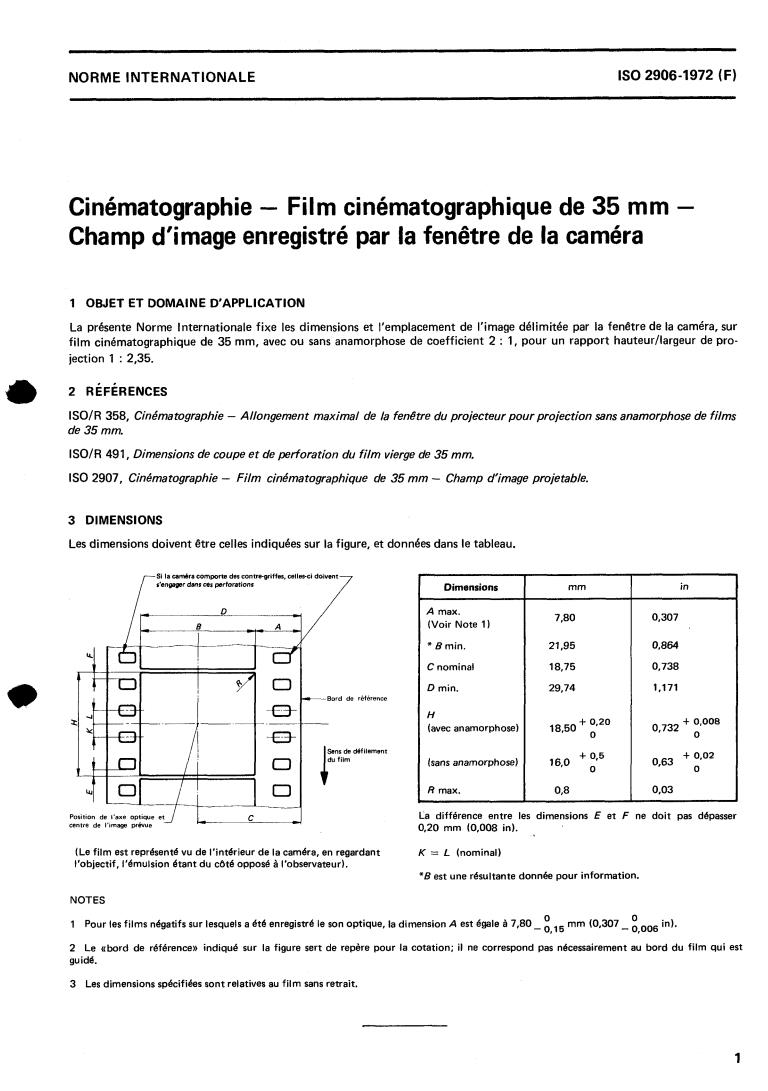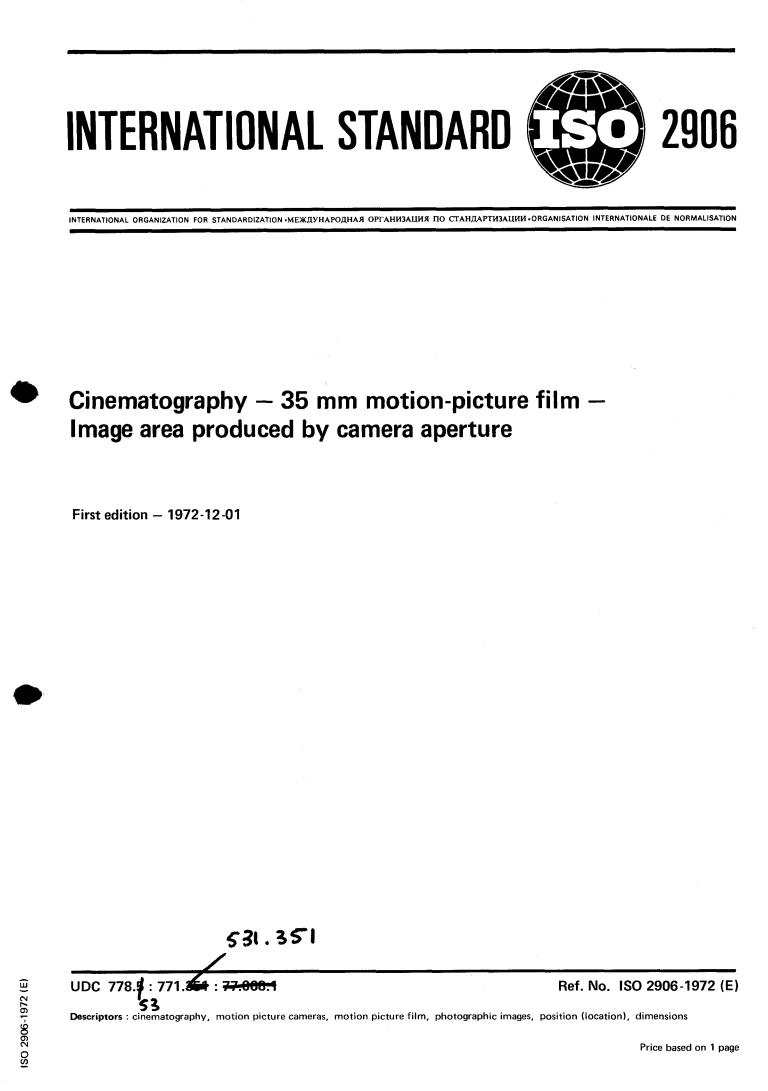 ISO 2906:1972 is a standard published by the International Organization for Standardization (ISO). Its full title is "Cinematography — 35 mm motion-picture film — Image area produced by camera aperture". This standard covers: Cinematography — 35 mm motion-picture film — Image area produced by camera aperture