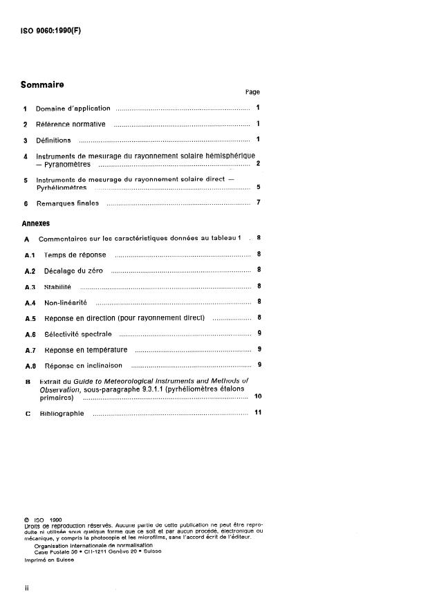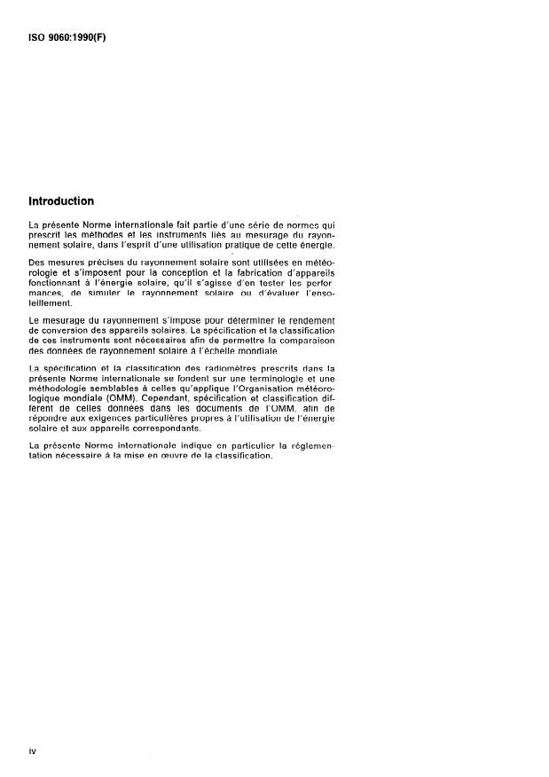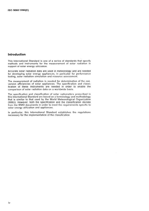 ISO 9060:1990 is a standard published by the International Organization for Standardization (ISO). Its full title is "Solar energy — Specification and classification of instruments for measuring hemispherical solar and direct solar radiation". This standard covers: Establishes a classification and specification of instruments for the measurement of hemispherical solar and direct solar radiation integrated over the spectral range from 0,3 µm to 3 µm.