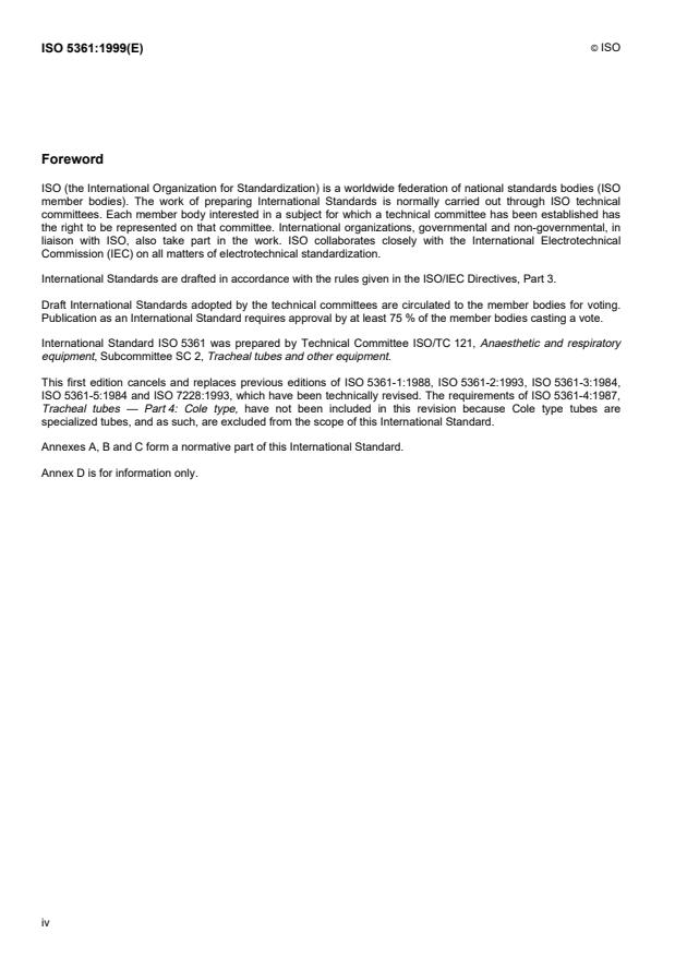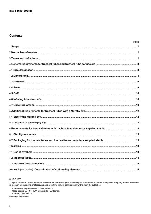 ISO 5361:1999 is a standard published by the International Organization for Standardization (ISO). Its full title is "Anaesthetic and respiratory equipment — Tracheal tubes and connectors". This standard covers: Anaesthetic and respiratory equipment — Tracheal tubes and connectors